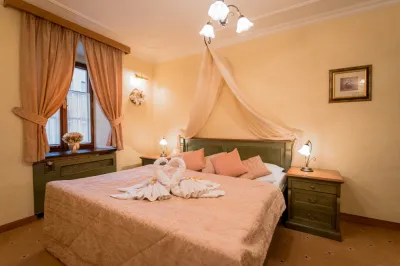 Elegantní interiér apartmánu v teplých tónech podtrhuje výjimečnou atmosféru tohoto prostoru. Apartmán se nachází v prvním patře historické budovy s masivním zdivem, které přirozeně zajišťuje příjemnou teplotu po celý rok.